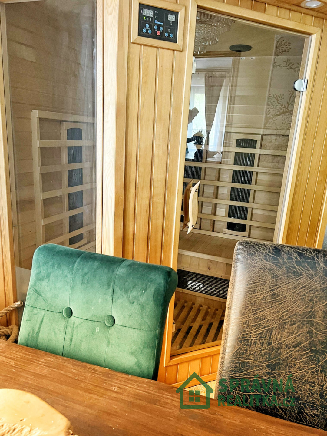 - Obývací pokoj: rozkládací pohovka, TV (165 cm), čtyřmístná infrasauna, jídelní stůl
