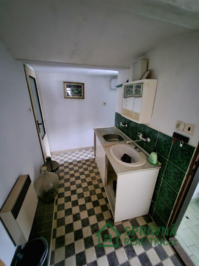V přízemí domu se nachází obytná část s útulným obývacím pokojem, jehož dominantou je krásný krb, který vytváří příjemnou atmosféru. Další místnost v přízemí je připravena ke kompletní rekonstrukci a nabízí ideální prostor například pro ložnici nebo pracovnu. Dále je zde menší kuchyňský kout, koupelna se sprchovým koutem a WC a také praktický sklípek.